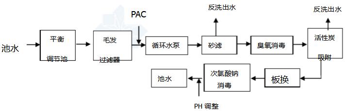 本泳池循環水溢流至平衡調節池,調節池內設柵網,再經毛發聚集器,